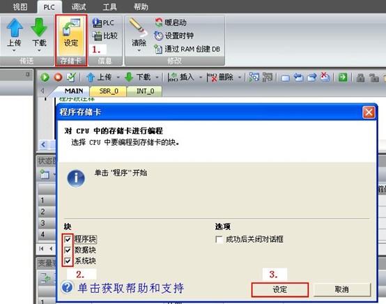 Micro/WIN SMART 中,點擊“PLC”->“存儲卡設定,打開程序存儲卡對話框,選擇需要被拷貝到存儲卡上的塊(程序塊、系統塊、數據塊),點擊編程設定,如圖2所示;